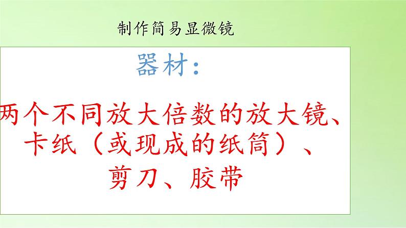器材:两个不同放大倍数的放大镜、卡纸(或现成的纸筒)、剪刀、胶带