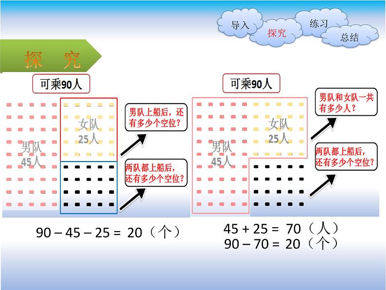 这是一份北师大版二年级上册秋游教案配套课件ppt,共20页。PPT课件主要包含了创设情境,这条船可以坐90人,新知探究,-45-25=,-628人,巩固练习,-33-25,-39-45,-91-8,一班订的报刊最少等内容,欢迎下载使用。