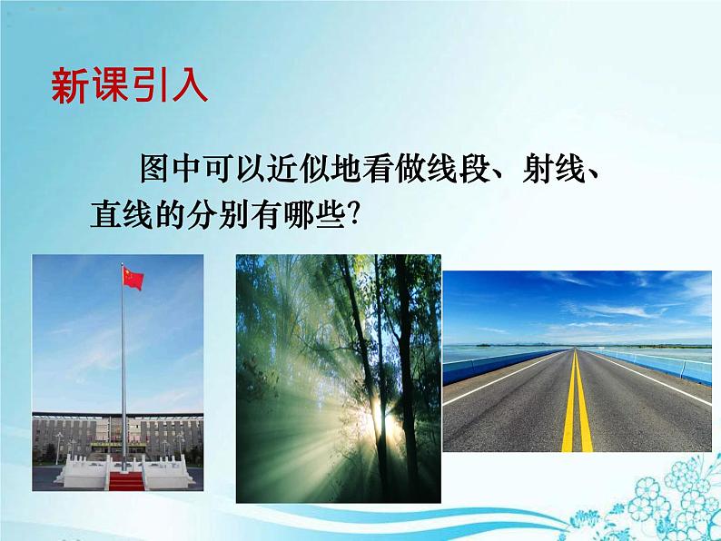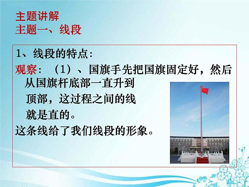 1、线段的特点:观察:(1)、国旗手先把国旗固定好,然后从国旗杆底部一直升到 顶部,这过程之间的线 就是直的。这条线给了我们线段的形象。