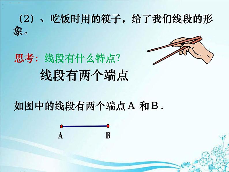 (2)、吃饭时用的筷子,给了我们线段的形象。