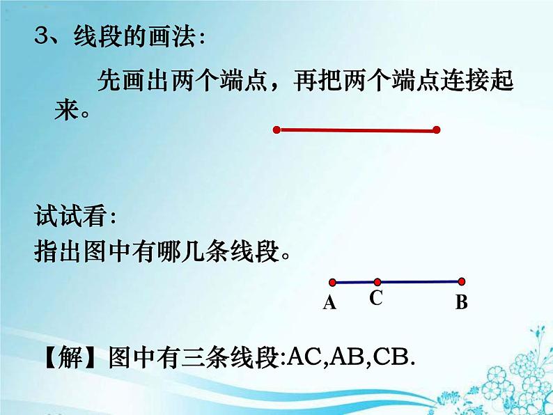 先画出两个端点,再把两个端点连接起来。试试看:指出图中有哪几条线段。 【解】图中有三条线段:AC,AB,CB.