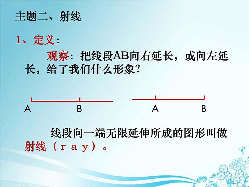 1、定义: 观察:把线段AB向右延长,或向左延长,给了我们什么形象? 线段向一端无限延伸所成的图形叫做射线(ray)。