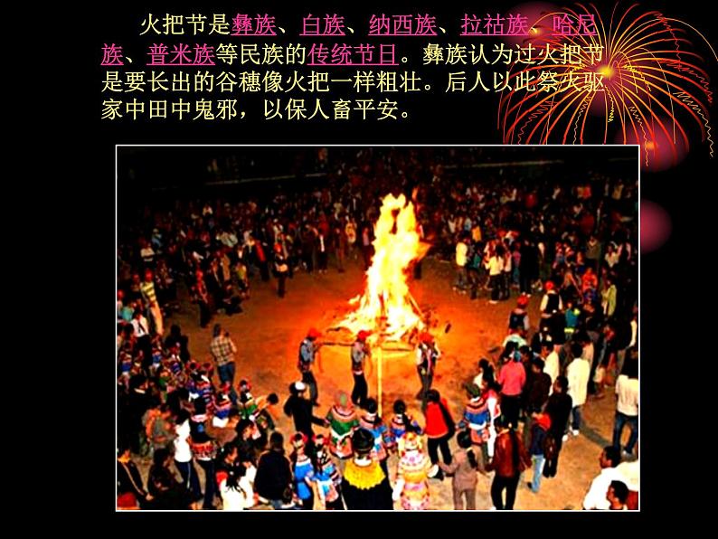 火把节是彝族、白族、纳西族、拉祜族、哈尼族、普米族等民族的传统节日。彝族认为过火把节是要长出的谷穗像火把一样粗壮。后人以此祭火驱家中田中鬼邪,以保人畜平安。