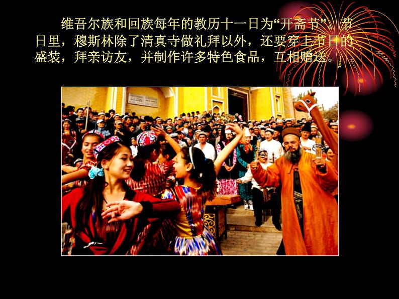维吾尔族和回族每年的教历十一日为“开斋节”。节日里,穆斯林除了清真寺做礼拜以外,还要穿上节日的盛装,拜亲访友,并制作许多特色食品,互相赠送。