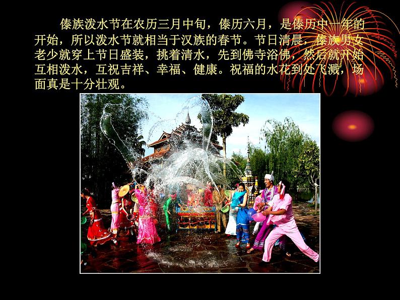傣族泼水节在农历三月中旬,傣历六月,是傣历中一年的开始,所以泼水节就相当于汉族的春节。节日清晨,傣族男女老少就穿上节日盛装,挑着清水,先到佛寺浴佛,然后就开始互相泼水,互祝吉祥、幸福、健康。祝福的水花到处飞溅,场面真是十分壮观。