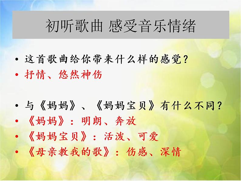 这首歌曲给你带来什么样的感觉?抒情、悠然神伤与《妈妈》、《妈妈宝贝》有什么不同?《妈妈》:明朗、奔放《妈妈宝贝》:活泼、可爱《母亲教我的歌》:伤感、深情