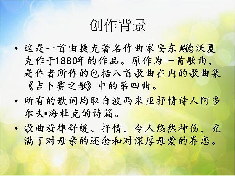 这是一首由捷克著名作曲家安东尼▪德沃夏克作于1880年的作品。原作为一首歌曲,是作者所作的包括八首歌曲在内的歌曲集《吉卜赛之歌》中的第四曲。所有的歌词均取自波西米亚抒情诗人阿多尔夫▪海杜克的诗篇。歌曲旋律舒缓、抒情,令人悠然神伤,充满了对母亲的还念和对深厚母爱的眷恋。