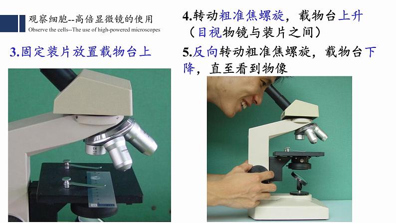 4.转动粗准焦螺旋,载物台上升(目视物镜与装片之间)