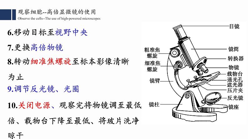 10.关闭电源、观察完将物镜调至最低倍、载物台下降至最低、将玻片洗净晾干