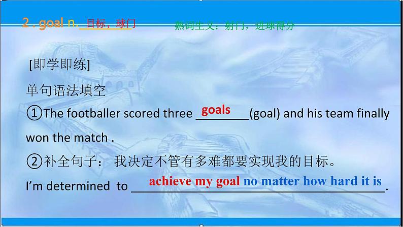 [即学即练]单句语法填空①The ftballer scred three ________(gal) and his team finally wn the match .②补全句子: 我决定不管有多难都要实现我的目标。I’m determined t ______________________________________.