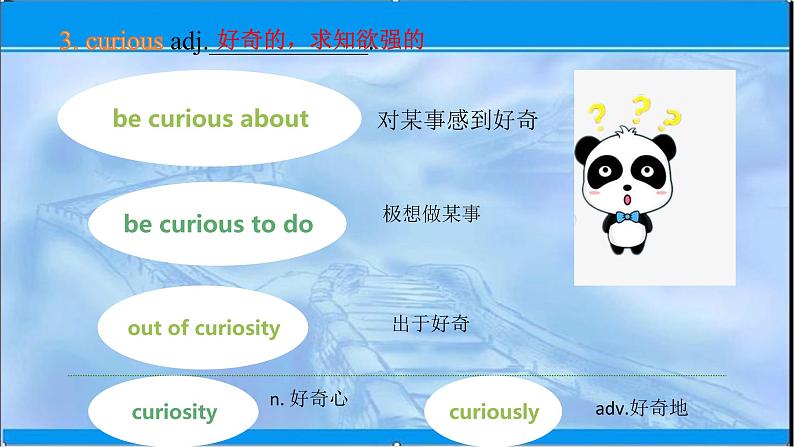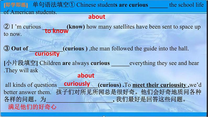 [即学即练] 单句语法填空① Chinese students are curius ______ the schl life f American students. ② I ’m curius ________(knw) hw many satellites have been sent t space up t nw. ③ Out f ___________(curius ) ,the man fllwed the guide int the hall. [小片段填空] Children are always curius ______everything they see and hear .They will ask all kinds f questins _____________(curius) .T meet their curiusity ,we’d better answer them. 孩子们对所见所闻总是很好奇。他们会好奇地质问各种各样的问题。为______________________, 我们最好是回答这些问题。