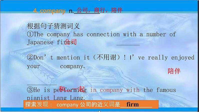 根据句子猜测词义①The cmpany has cnnectin with a number f Japanese firms. _______②Dn’t mentin it(不用谢)! I’ve really enjyed yur cmpany. _________③He is perfrming in cmpany with the famus pianist Lang Lang. __________