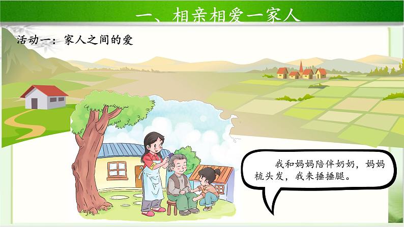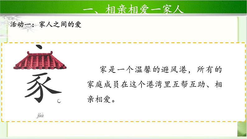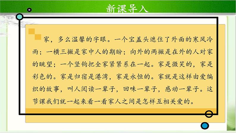 家,多么温馨的字眼。一个宝盖头遮住了外面的寒风冷雨;一横三撇是家中人的期盼;向外的两撇是在外的人对家的眺望;一个竖钩把全家紧紧系在一起。家是微笑的,家是彩色的。家是归宿是港湾,家是永恒的。家就是这样由爱编织的故事,叫人阅读一辈子,回味一辈子,感动一辈子。这节课我们就一起来看一看家人之间是怎样互相关爱的。