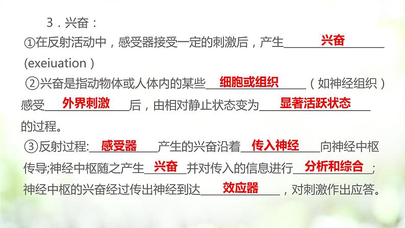 ③反射过程:_____________产生的兴奋沿着_______________向神经中枢传导;神经中枢随之产生________并对传入的信息进行_______________;神经中枢的兴奋经过传出神经到达_______________,对刺激作出应答。