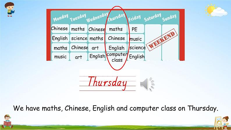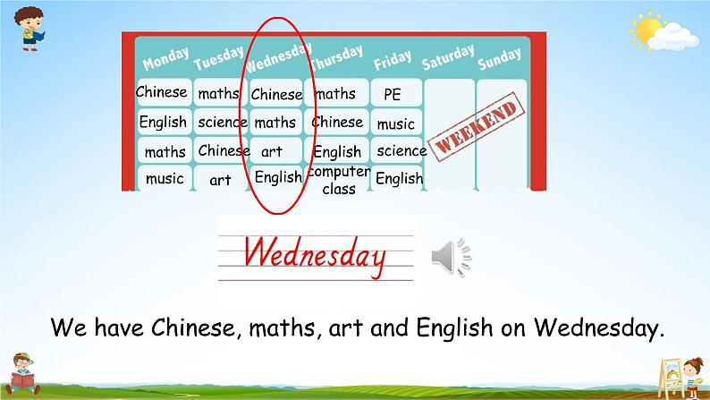 ( C) 2. IEnglish, maths, PE and art.A. amB. dC. have ( A ) 3. Is it?A. SaturdayB. sundayC. saturday ( C ) 4.is the first f the week.A. MndayB. weekendC. Sunday