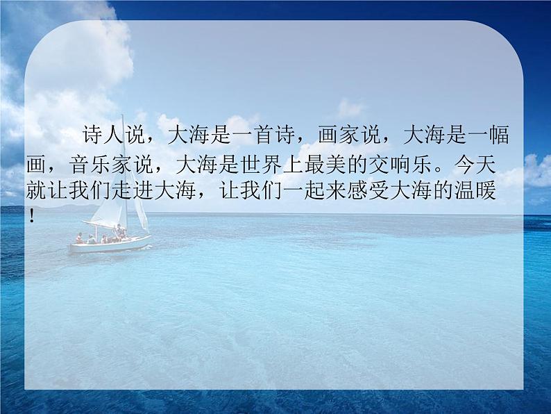 诗人说,大海是一首诗,画家说,大海是一幅画,音乐家说,大海是世界上最美的交响乐。今天就让我们走进大海,让我们一起来感受大海的温暖!