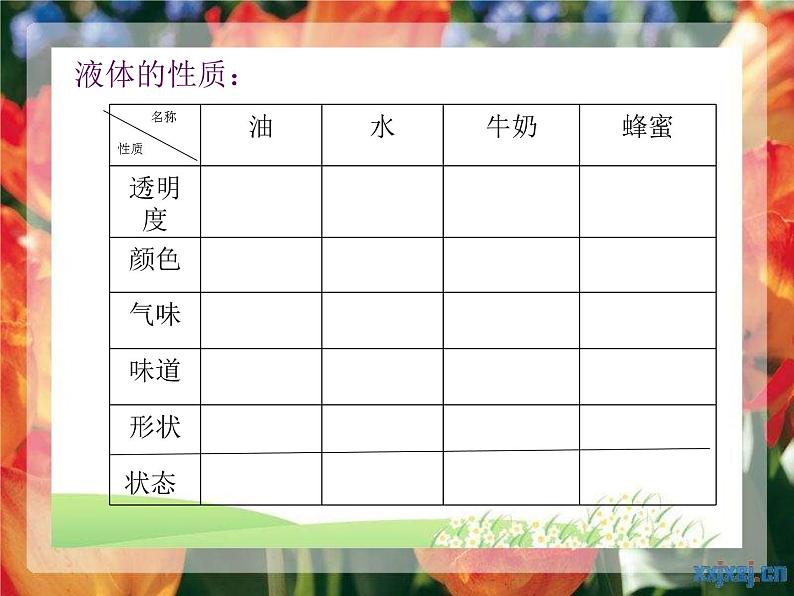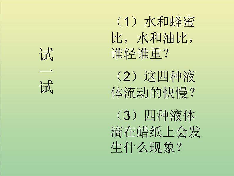 (1)水和蜂蜜比,水和油比,谁轻谁重?(2)这四种液体流动的快慢?(3)四种液体滴在蜡纸上会发生什么现象?