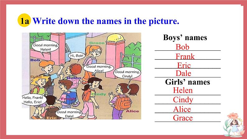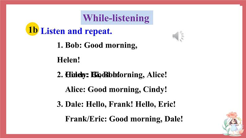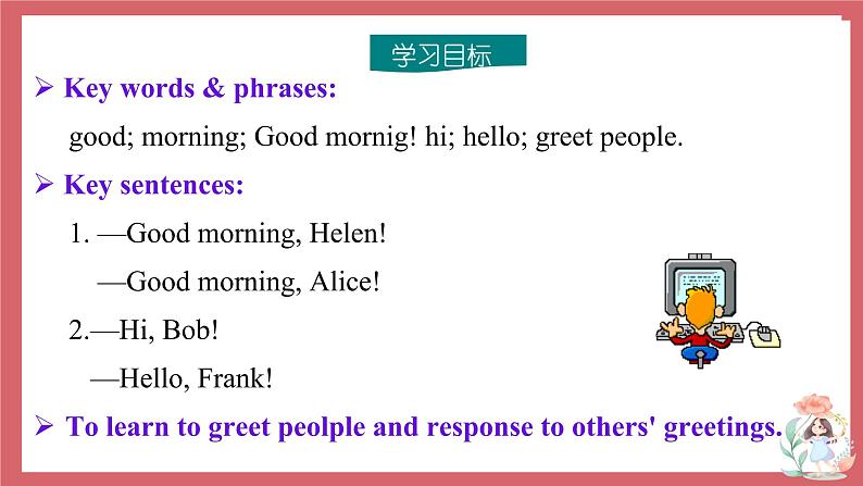 Key wrds & phrases: gd; mrning; Gd mrnig! hi; hell; greet peple. Key sentences: 1. —Gd mrning, Helen! —Gd mrning, Alice! 2.—Hi, Bb! —Hell, Frank!T learn t greet pelple and respnse t thers' greetings.