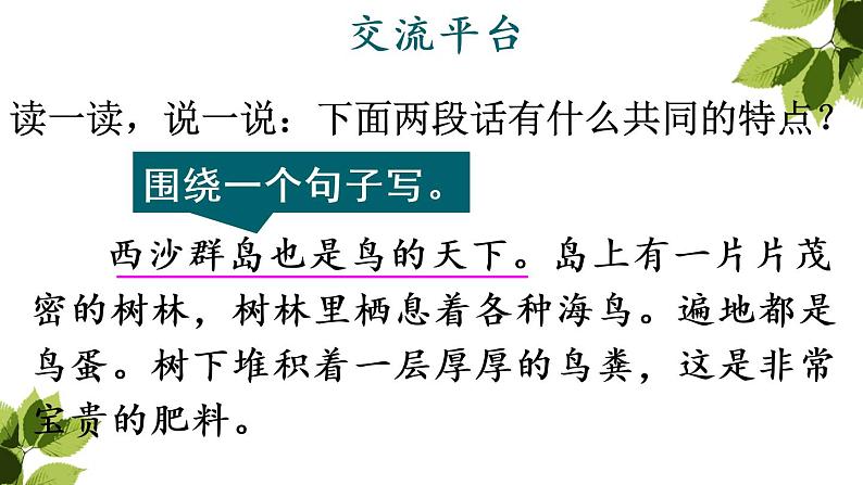 这是一份语文三年级上册语文园地课文内容ppt课件,共21页。PPT课件主要包含了围绕一个句子写,交流平台,素材库,左形右声,下形上声,形声字的分类,练习巩固,词语对对碰等内容,欢迎下载使用。