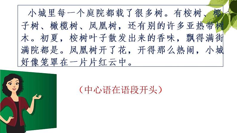 能够概括文章或段落主要内容的句子就叫作“中心句”。中心句有以下几个特点:①在段的开头的中心句起概括和总述作用;②在段的中间的中心句起承上启下的作用;③在段的末尾的中心句起归纳和总结作用;④起强调和增强印象作用的中心句一般在段的开头和结尾。