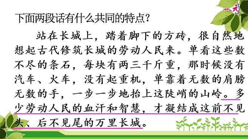 站在长城上,踏着脚下的方砖,很自然地想起古代修筑长城的劳动人民来。单看这些数不尽的条石,每块有两三千斤重,那时候没有汽车、火车,没有起重机,单靠着无数的肩膀无数的手,一步一步地抬上这陡峭的山岭。多少劳动人民的血汗和智慧,才凝结成这前不见头、后不见尾的万里长城。