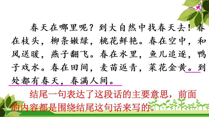 结尾一句表达了这段话的主要意思,前面的内容都是围绕结尾这句话来写的。