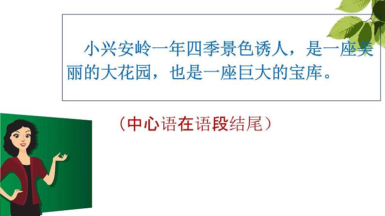 小兴安岭一年四季景色诱人,是一座美丽的大花园,也是一座巨大的宝库。 (中心语在语段结尾)