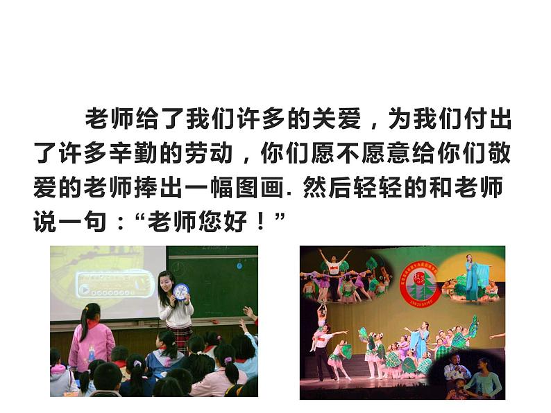 老师给了我们许多的关爱,为我们付出了许多辛勤的劳动,你们愿不愿意给你们敬爱的老师捧出一幅图画. 然后轻轻的和老师说一句:“老师您好!”