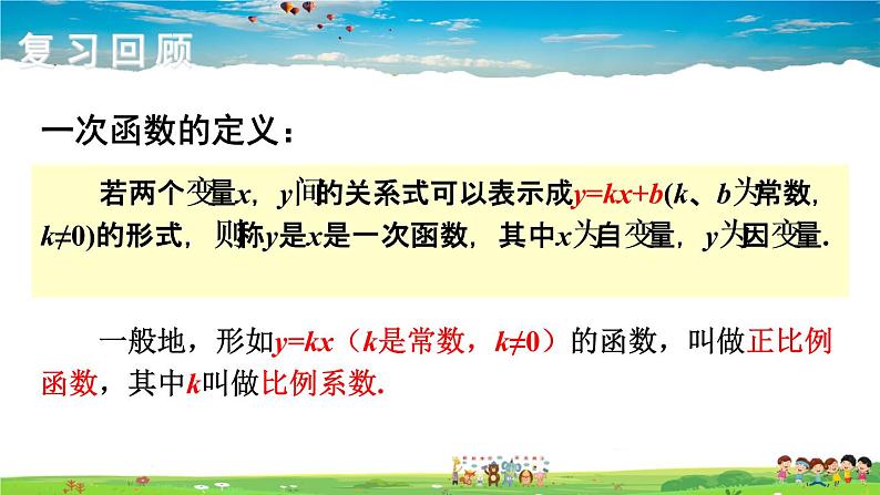 若两个变量x,y间的关系式可以表示成y=kx+b(k、b为常数,k≠0)的形式,则称y是x是一次函数,其中x为自变量,y为因变量.