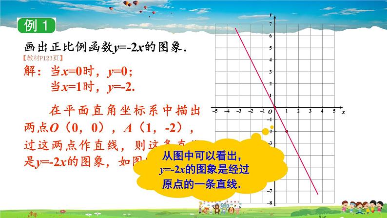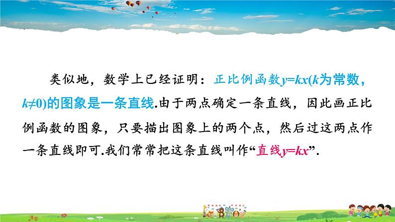类似地,数学上已经证明:正比例函数y=kx(k为常数,k≠0)的图象是一条直线.由于两点确定一条直线,因此画正比例函数的图象,只要描出图象上的两个点,然后过这两点作一条直线即可.我们常常把这条直线叫作“直线y=kx”.