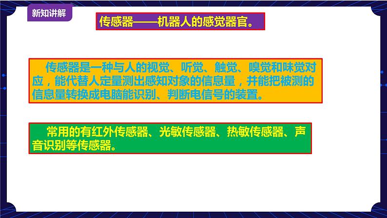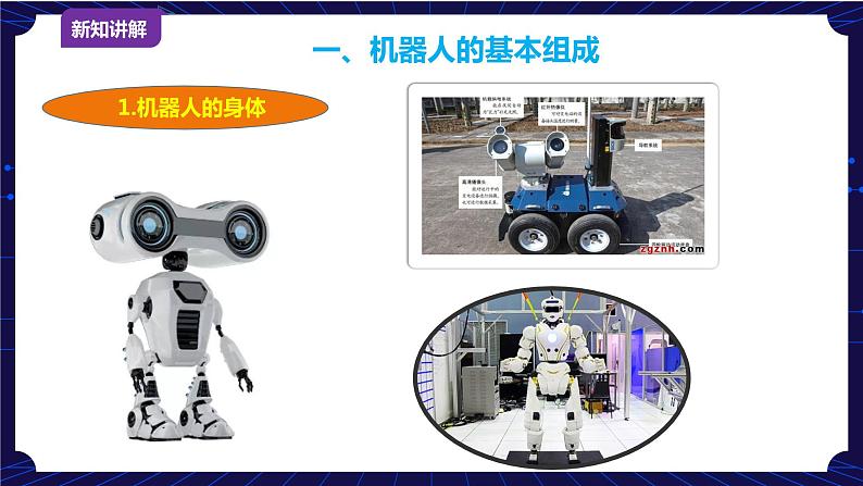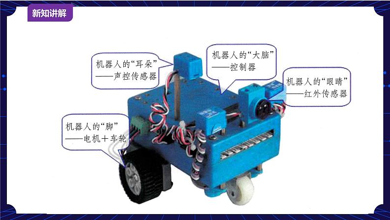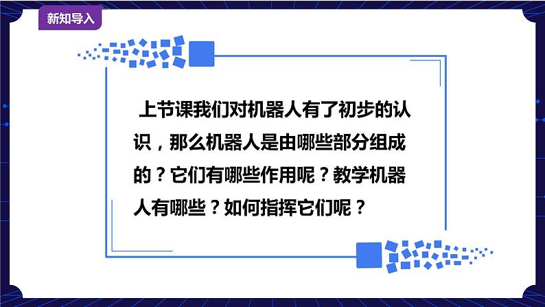 导入新课 | 上节课我们对机器人有了初步的认识,那么机器人是由哪些部分组成的?它们有哪些作用呢?教学机器人有哪些?如何指挥它们呢? |