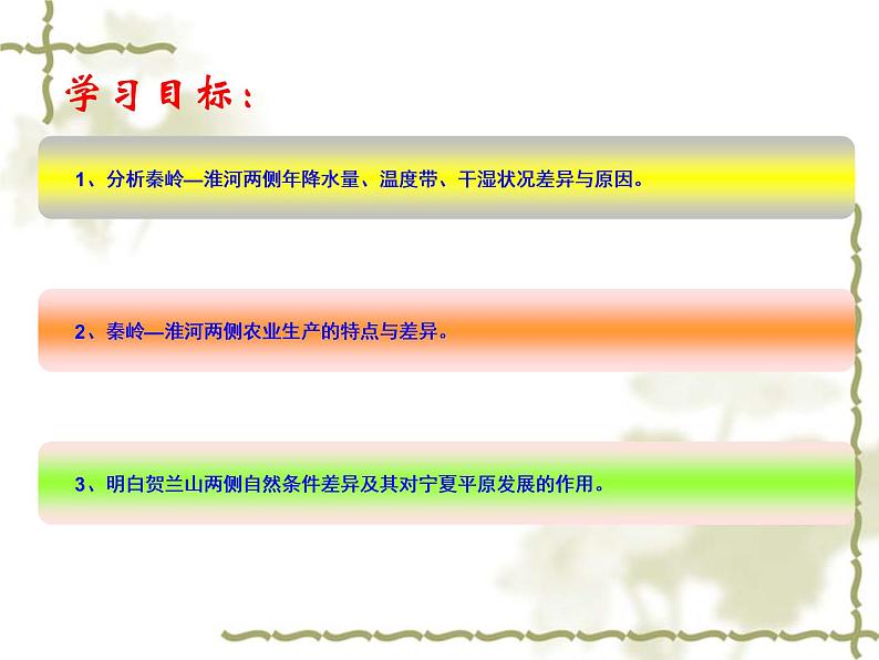 这是一份粤教版八年级下册第二节 重要的地理分界线示范课ppt课件,共25页。PPT课件主要包含了学习目标,温度带不同,月0℃等温线,结冰期不同,干湿状况不同,毫米等降水量线,植被不同,耕作制度不同,耕地类型不同,作物不同等内容,欢迎下载使用。