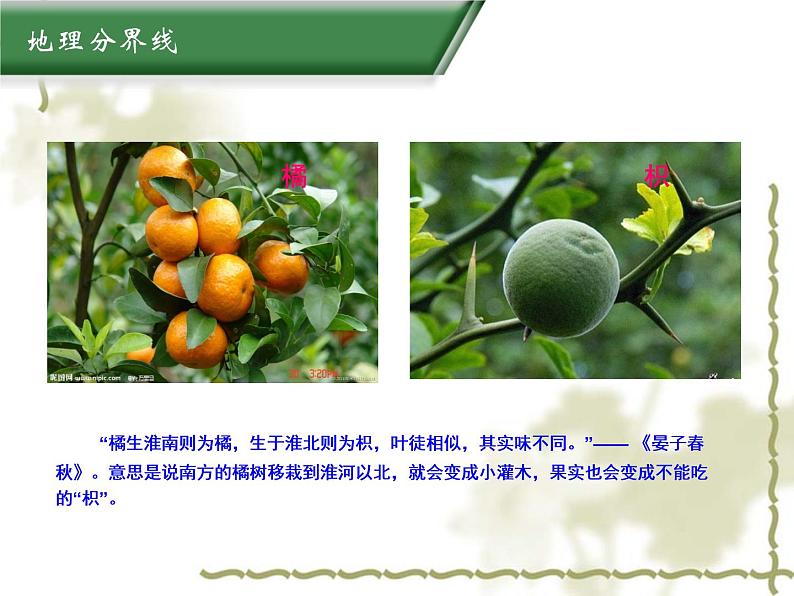 “橘生淮南则为橘,生于淮北则为枳,叶徒相似,其实味不同。”—— 《晏子春秋》。意思是说南方的橘树移栽到淮河以北,就会变成小灌木,果实也会变成不能吃的“枳”。