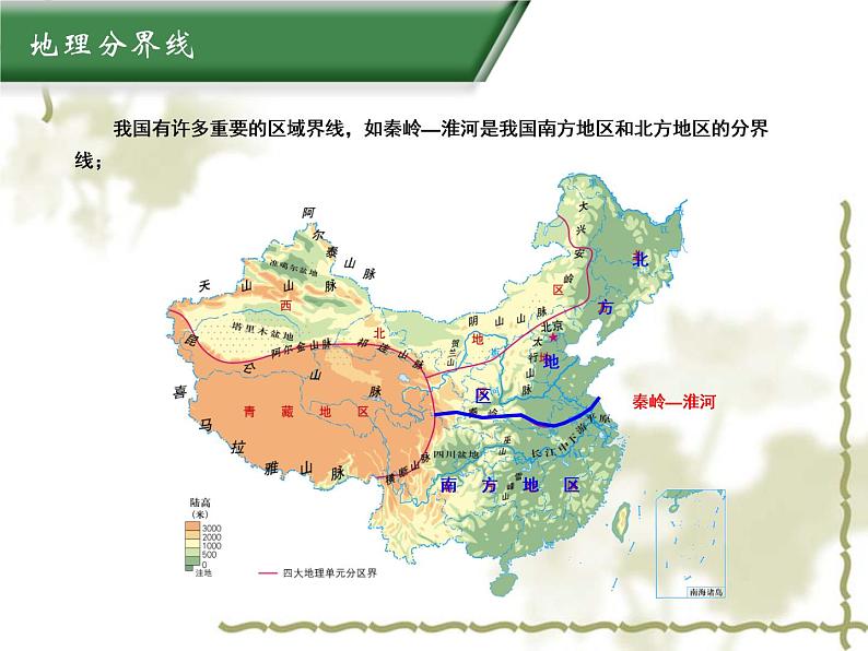 我国有许多重要的区域界线,如秦岭—淮河是我国南方地区和北方地区的分界线;