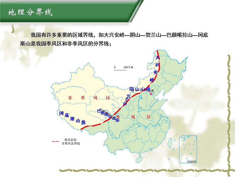 我国有许多重要的区域界线,如大兴安岭—阴山—贺兰山—巴颜喀拉山—冈底斯山是我国季风区和非季风区的分界线;