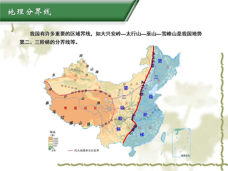 我国有许多重要的区域界线,如大兴安岭—太行山—巫山—雪峰山是我国地势第二、三阶梯的分界线等。