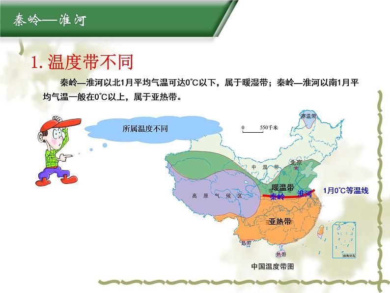秦岭—淮河以北1月平均气温可达0℃以下,属于暖湿带;秦岭—淮河以南1月平均气温一般在0℃以上,属于亚热带。