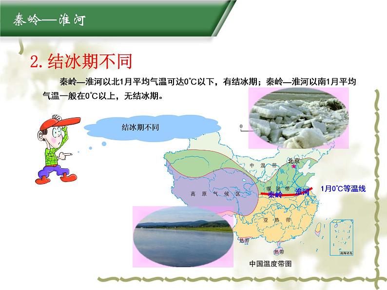 秦岭—淮河以北1月平均气温可达0℃以下,有结冰期;秦岭—淮河以南1月平均气温一般在0℃以上,无结冰期。