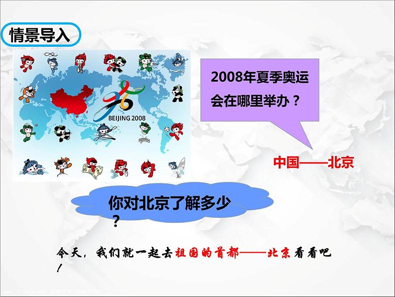 这是一份人教版 (新课标)八年级下册第六章 北方地区第四节 祖国的首都——北京课前预习课件ppt,共34页。PPT课件主要包含了中国北京,你对北京了解多少,情景导入,一政治文化中心,北京的符号,首都北京的符号,天安门广场,人民大会堂,新课学习,古城北京的符号等内容,欢迎下载使用。