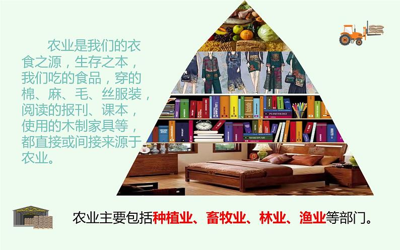 农业是我们的衣食之源,生存之本,我们吃的食品,穿的棉、麻、毛、丝服装,阅读的报刊、课本,使用的木制家具等,都直接或间接来源于农业。
