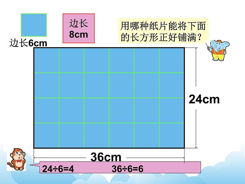 还有哪些边长是整厘米数的正方形纸片也能铺满这个长方形?在小组里交流。
