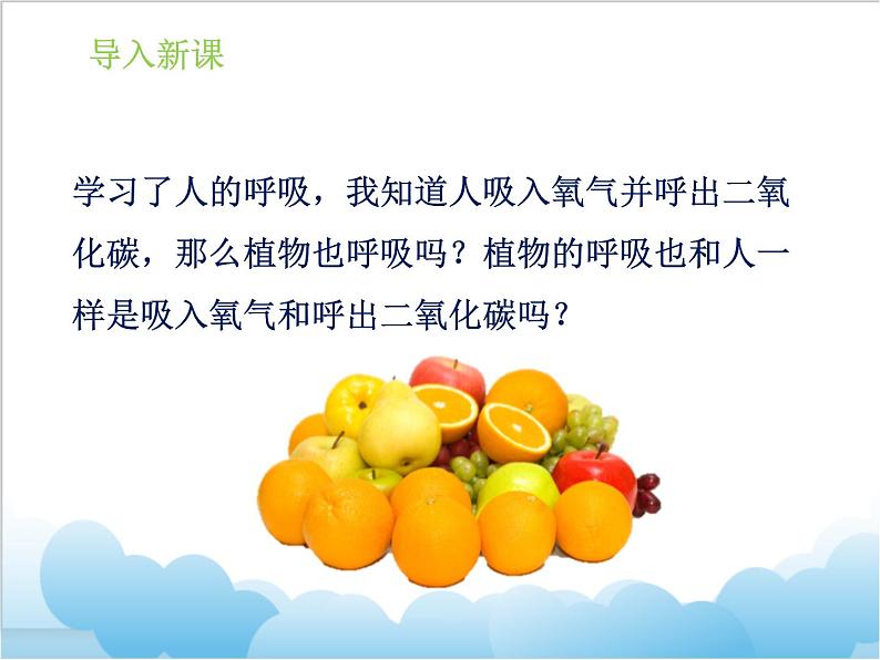 生物人教版 (新课标)第二节 绿色植物的呼吸作用教学演示ppt课件: 这是一份生物人教版 (新课标)第二节 绿色植物的呼吸作用教学演示ppt课件,共51页。PPT课件主要包含了知识回顾,引入新课,想一想,实验探究,实验现象,实验结论,二氧化碳,呼吸作用,植物的呼吸作用,呼吸作用的意义等内容,欢迎下载使用。