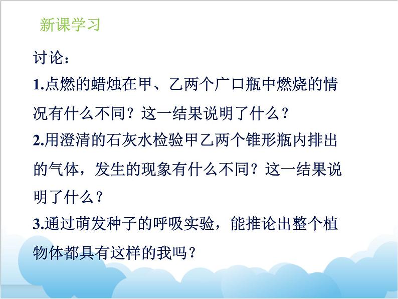 讨论:1.点燃的蜡烛在甲、乙两个广口瓶中燃烧的情况有什么不同?这一结果说明了什么?2.用澄清的石灰水检验甲乙两个锥形瓶内排出的气体,发生的现象有什么不同?这一结果说明了什么?3.通过萌发种子的呼吸实验,能推论出整个植物体都具有这样的我吗?