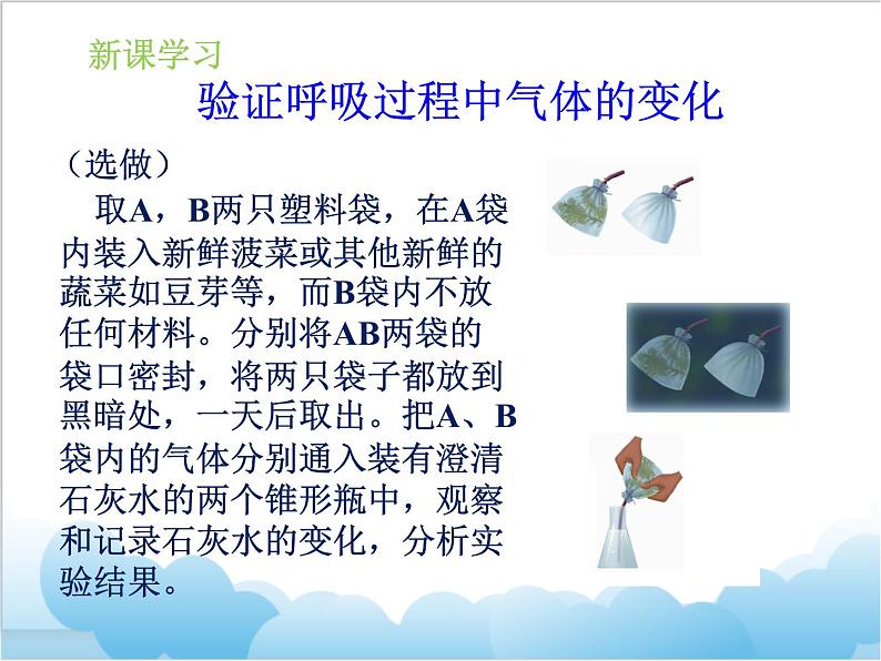 取A,B两只塑料袋,在A袋内装入新鲜菠菜或其他新鲜的蔬菜如豆芽等,而B袋内不放任何材料。分别将AB两袋的袋口密封,将两只袋子都放到黑暗处,一天后取出。把A、B袋内的气体分别通入装有澄清石灰水的两个锥形瓶中,观察和记录石灰水的变化,分析实验结果。