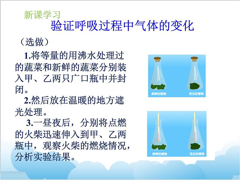 1.将等量的用沸水处理过的蔬菜和新鲜的蔬菜分别装入甲、乙两只广口瓶中并封闭。 2.然后放在温暖的地方遮光处理。 3.一昼夜后,分别将点燃的火柴迅速伸入到甲、乙两瓶中,观察火柴的燃烧情况,分析实验结果。