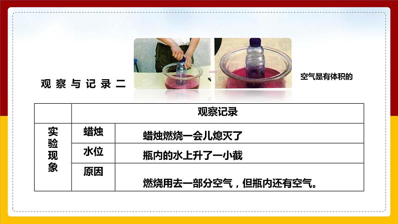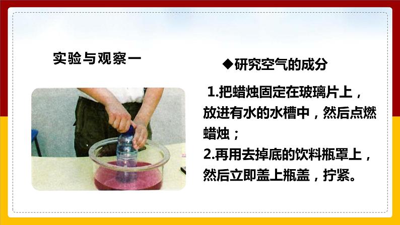 1.把蜡烛固定在玻璃片上,放进有水的水槽中,然后点燃蜡烛;2.再用去掉底的饮料瓶罩上,然后立即盖上瓶盖,拧紧。