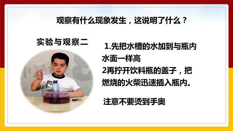 1.先把水槽的水加到与瓶内水面一样高2再拧开饮料瓶的盖子,把燃烧的火柴迅速插入瓶内。