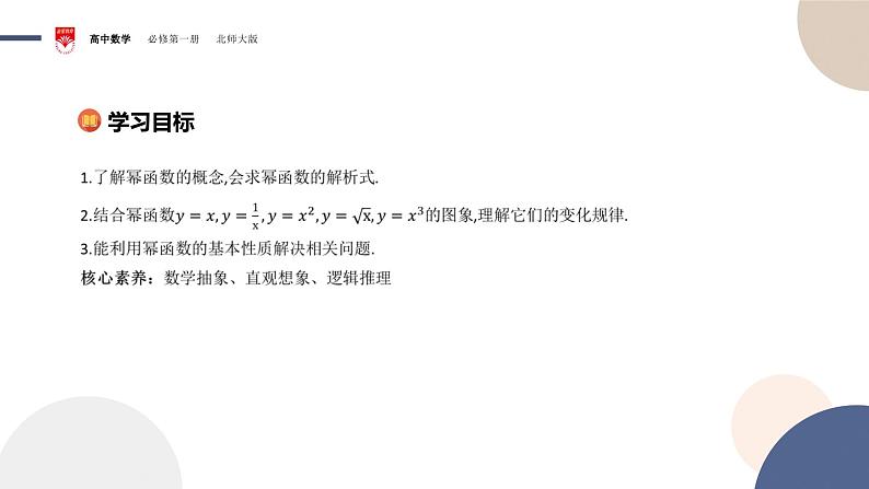 名师点析 幂函数y=xα的上述性质可归纳如下:(1)当α>0时,图象都通过点(0,0),(1,1);在第一象限内,函数单调递增.(2)当α<0时,图象都通过点(1,1);在第一象限内,函数单调递减,图象向上与y轴无限接近,向右与x轴无限接近.