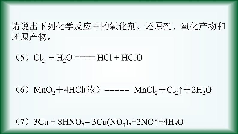 (5)Cl2 + H2O ==== HCl + HClO (6)MnO2+4HCl(浓)===== MnCl2+Cl2↑+2H2O(7)3Cu + 8HNO3= 3Cu(NO3)2+2NO↑+4H2O