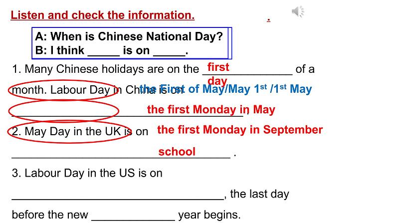 1. Many Chinese hlidays are n the ______________ f a mnth. Labur Day in China is n ____________________________________ .2. May Day in the UK is n __________________________________ .3. Labur Day in the US is n _________________________________, the last day befre the new _____________ year begins.